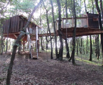 Le coin "habitation" sur pilotis, accueillant 3 lits en 140 / 190 ,dessert une passerelle , offrant l' accès à une terrasse perchée dans des chênes.